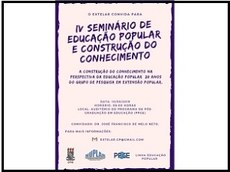 O Grupo de Pesquisa em Extensão Popular (EXTELAR) promove o “IV Seminário de Educação Popular e Construção do Conhecimento” nesta sexta-feira (10), a partir das 8h, no auditório do Programa de Pós-Graduação em Educação (PPGE), Centro de Educação da Universidade Federal da Paraíba (CE/UFPB), Campus I. Será desenvolvido o tema: “A construção do conhecimento na perspectiva da educação popular - 20 anos do grupo de pesquisa em extensão popular”.