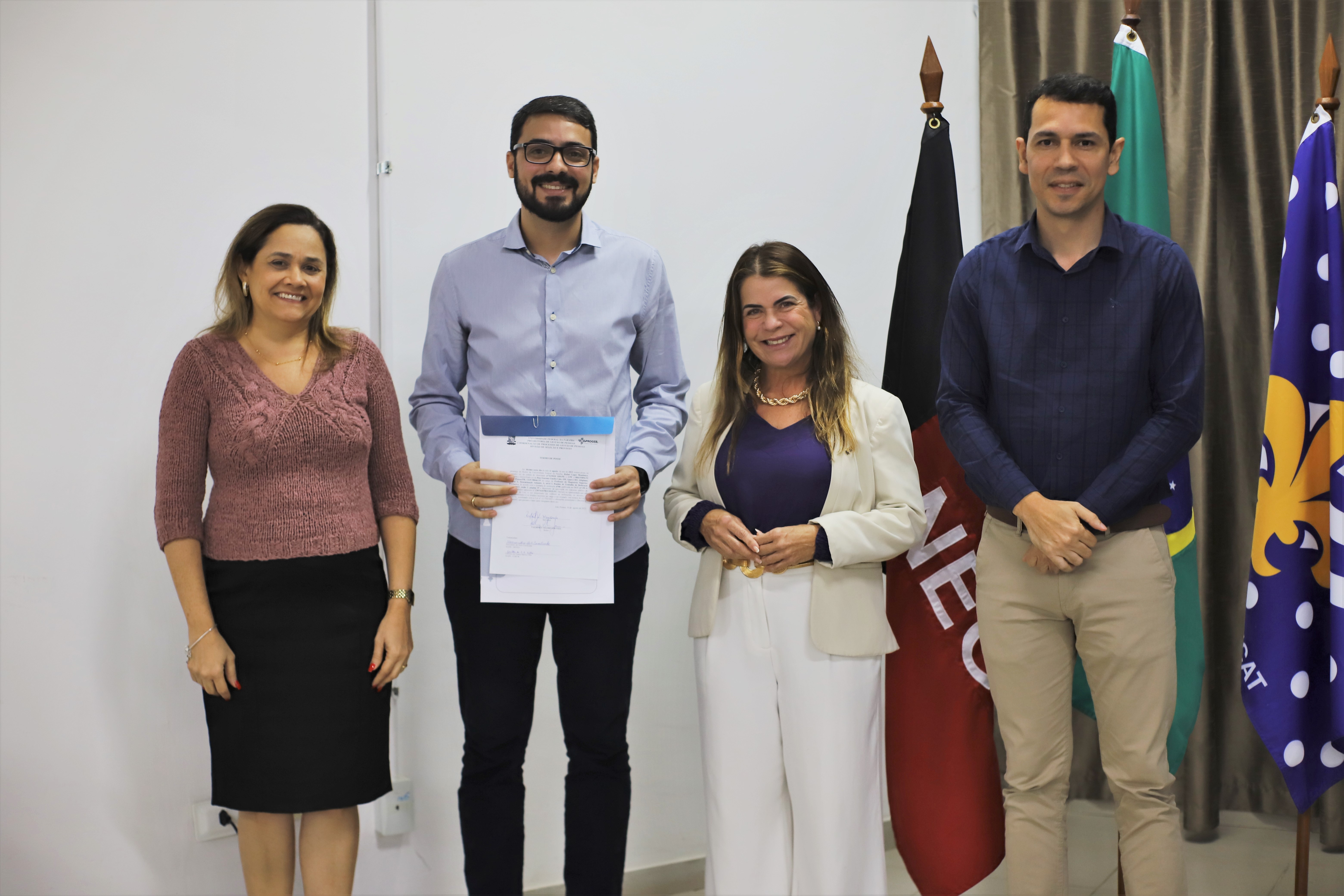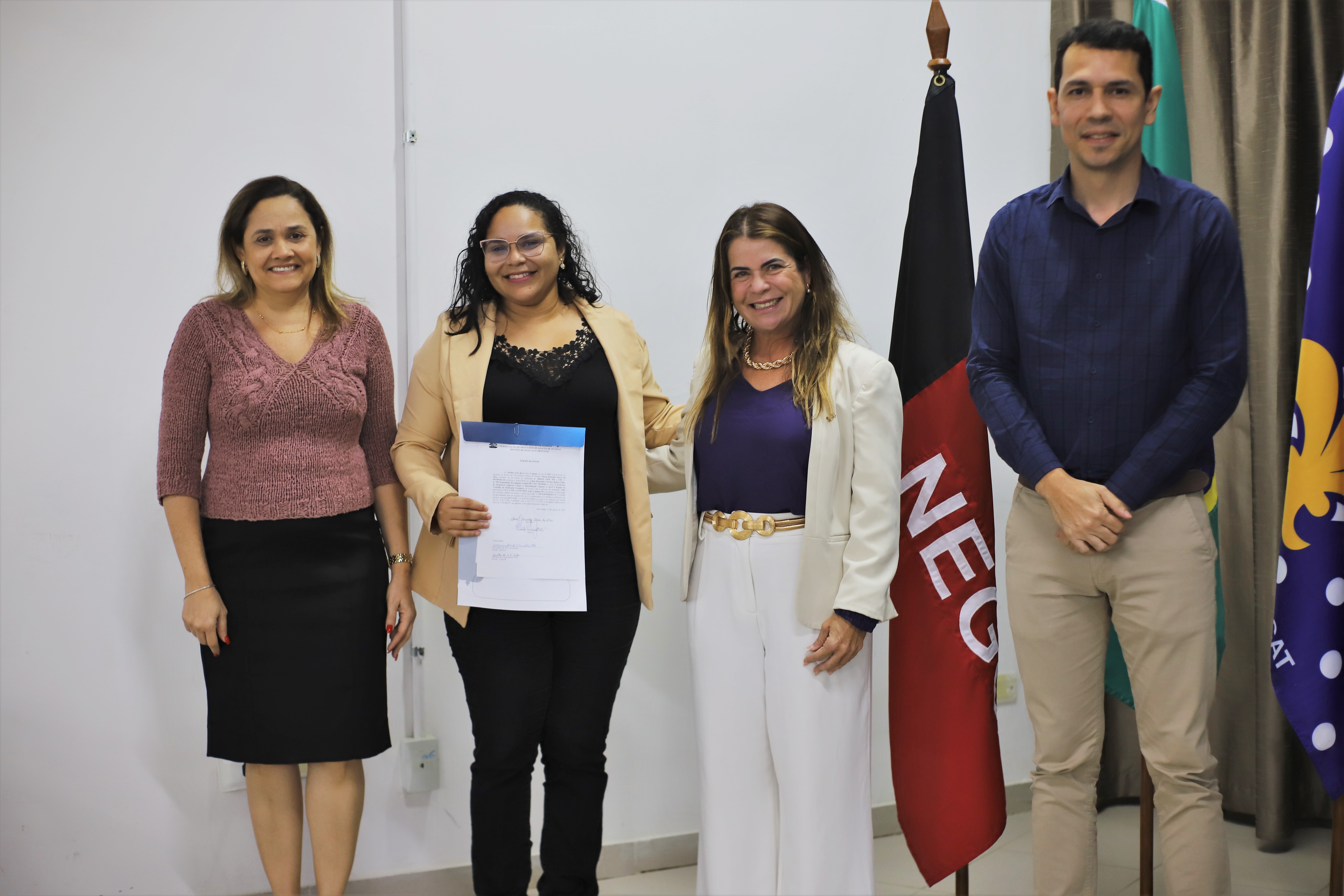 A solenidade de posse foi presidida pela Vice-Reitora Liana Filgueira e contou ainda com a presença da Pró-reitora de Gestão de Pessoas, Rita de Cássia e do Coordenador de Processos de Gestão de Pessoas, Fagner Oliveira.
